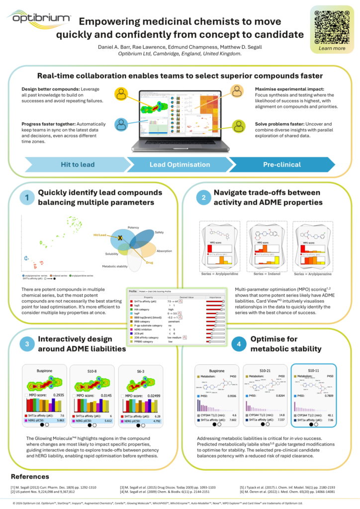 In this poster, we demonstrate how StarDrop’s integrated approach to compound design and multi-parameter optimisation empowers scientists to confidently prioritise high-quality compounds for synthesis and testing. StarDrop provides the environment that enables medicinal chemists to streamline decision-making, boost project productivity, and progress faster, together.