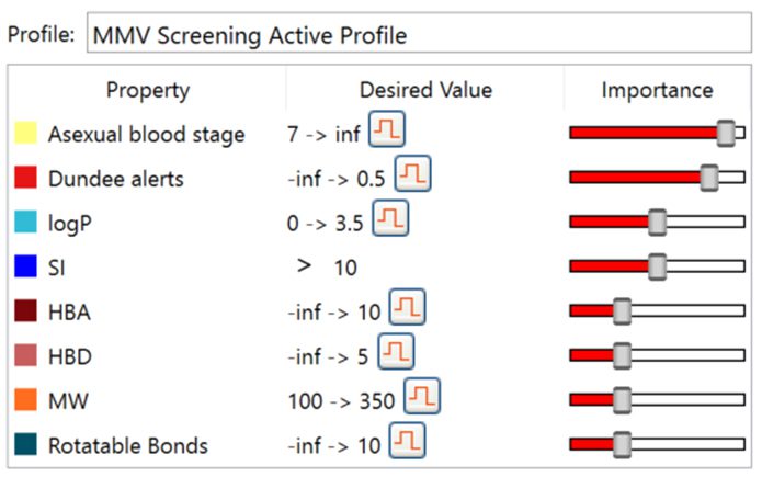 Medicines for Malaria Ventures (MMV) and Optibrium developed this property criteria and MMV Antimalarial Scoring Profile and represent their criteria for prioritisation of compounds.