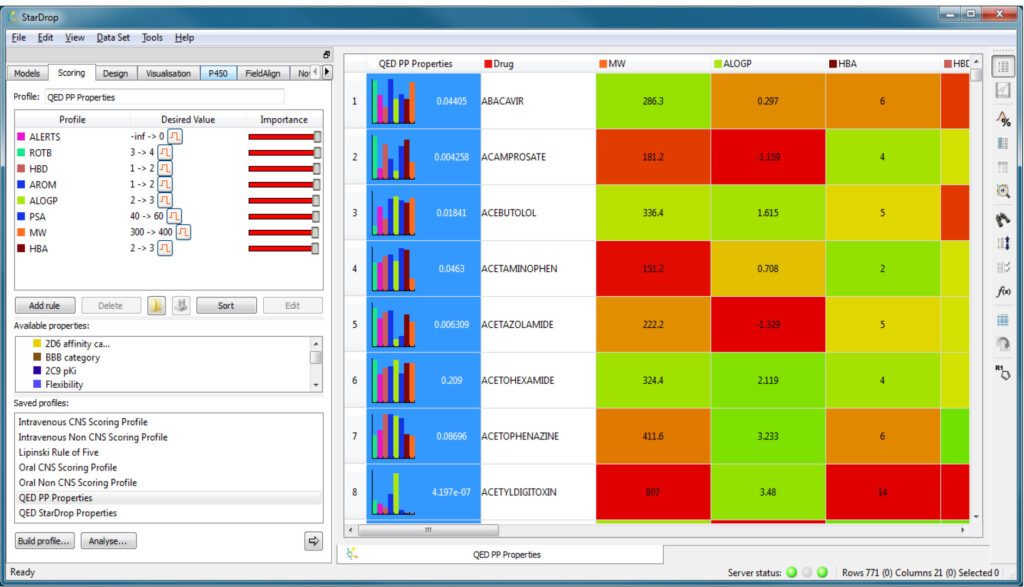 The scores for the compounds in the data set will be calculated and displayed, as shown above. The histograms in the score column indicate the contribution of each property to the overall score and this information is also shown as a heat map when the scoring column is selected.