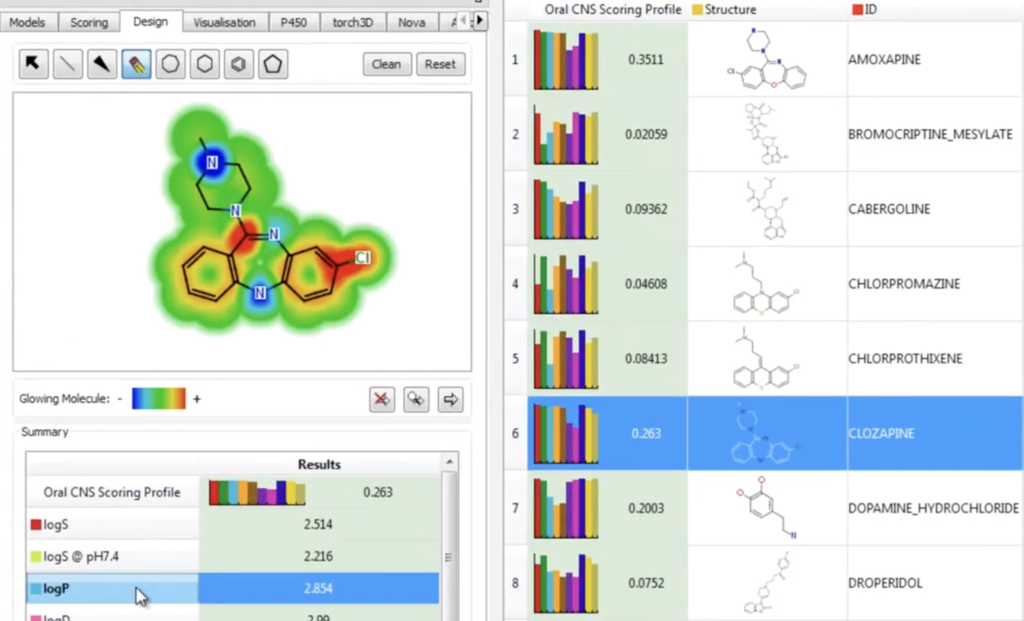 StarDrop’s Designer guides the re-design of your compounds and enables you to interactively explore the impact of structural changes on your compound’s predicted properties. The Glowing Molecule™ links the structure-activity relationships captured by advanced, non-linear modelling techniques with the structure of your compound, so that you can easily visualise the regions of your compound having the greatest impact on a property. This aids your interpretation of predictive models to guide the design of improved compounds.