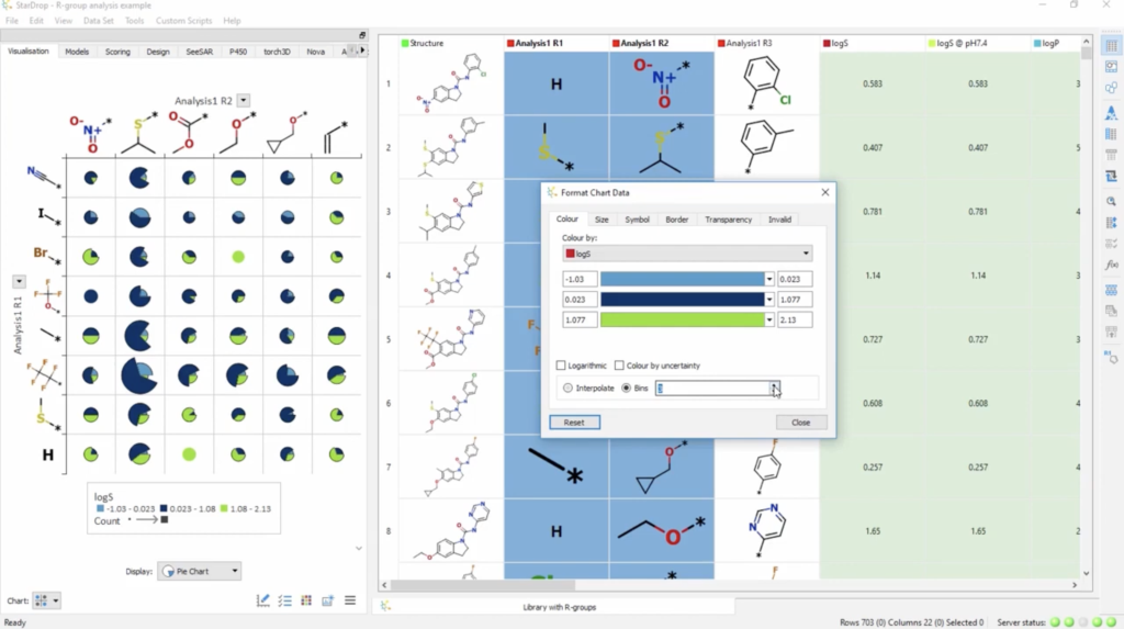 StarDrop’s visualisation capabilities include the ability to display various chart types within each cell of an SAR plot including: